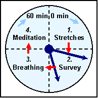 The specific stretches or postures, survey or relaxation methods, breathing practices, and types of meditation will also vary, depending on your level of expertise and predispositions. The amount of time spent with each of the practices may vary, depending on your own training and predispositions. The total length of practice (all four) may also vary (The 60-minute clock in the picture above is just an example). Whichever practices are done, and however the time is divided, practicing in this systematic way will definitely provide a deeper and richer meditation. See also
